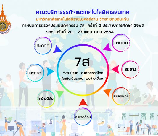 คณะบริหารธุรกิจและเทคโนโลยีสารสนเทศ มทร.อีสาน วิทยาเขตขอนแก่น กำหนดการตรวจประเมิน 7ส ครั้งที่ 1 ประจำปีการศึกษา 2564