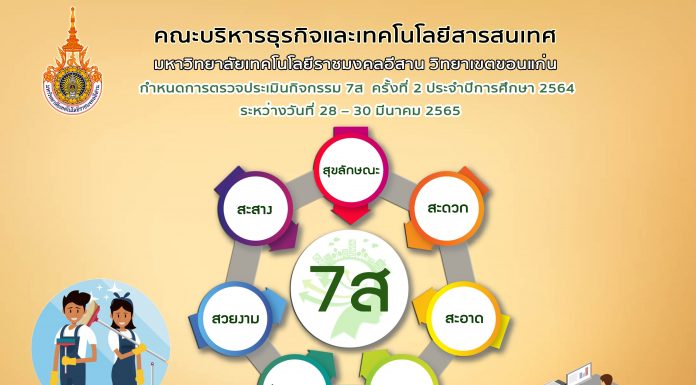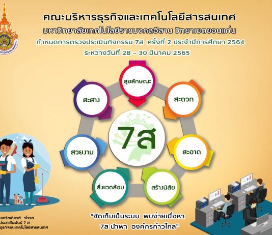คณะบริหารธุรกิจและเทคโนโลยีสารสนเทศมหาวิทยาลัยเทคโนโลยีราชมงคลอีสาน วิทยาเขตขอนแก่น กำหนดการตรวจประเมินกิจกรรม 7ส ครั้งที่ 2 ประจำปีการศึกษา 2564 ระหว่างวันที่ 28 - 30 มีนาคม 2565